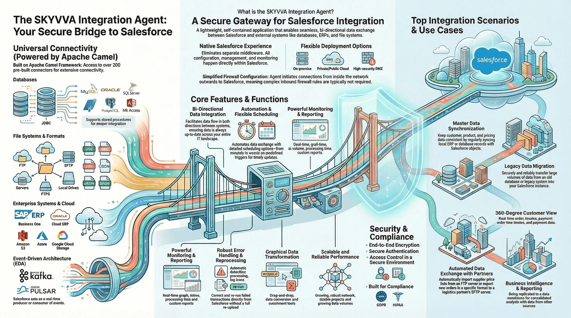 Der SKYVVA Integration Agent ist eine eigenständige Anwendung, die als sicheres Gateway zwischen Ihrer Salesforce-Instanz und externen Datenquellen fungiert. Er ist Teil der nativen SKYVVA Integration Solution und wurde für Unternehmen entwickelt, die Salesforce als zentrale Geschäftsplattform nutzen.