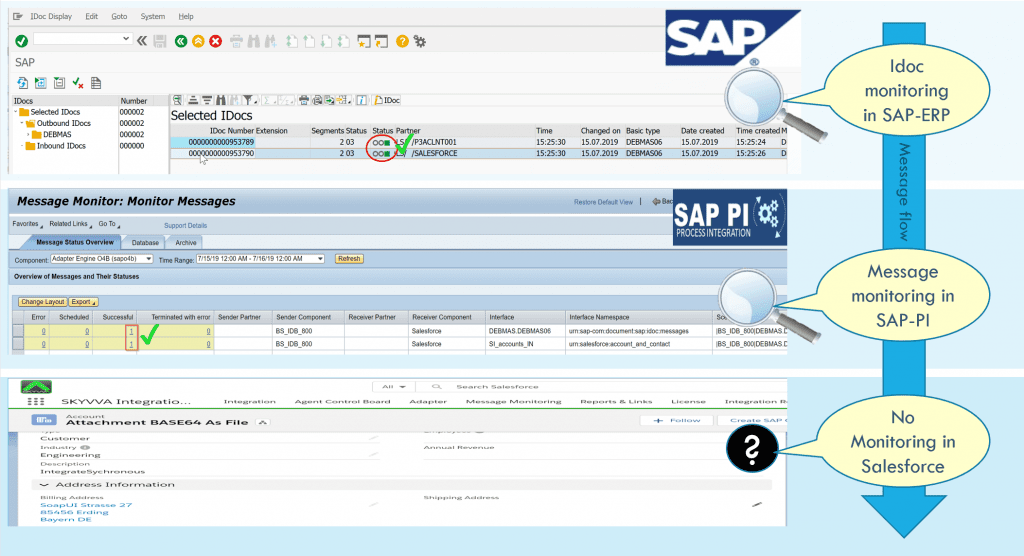 Werfen Sie nun einen Blick auf die Überwachung innerhalb des verbundenen Systems, wie in der folgenden Abbildung dargestellt. In diesem Beispiel wird die Integration in Salesforce über den Standard-API-Ansatz durchgeführt. In diesem Bildschirm können wir die verschiedenen Überwachungen auf dem Sender, z.B. SAP-ERP, auf der Middleware, z.B. SAP-PI, sehen, aber auf der Salesforce-Seite gibt es keine Überwachungsmöglichkeit mit der Standard Salesforce API. Was Sie tun können, ist, direkt das sObject Account zu überprüfen, um zu sehen, ob die Adressdaten geändert wurden. Wenn Sie die Adresse des Accounts überprüfen, werden die Änderungen nicht in Salesforce aktualisiert. Was ist also passiert und was können Sie tun?