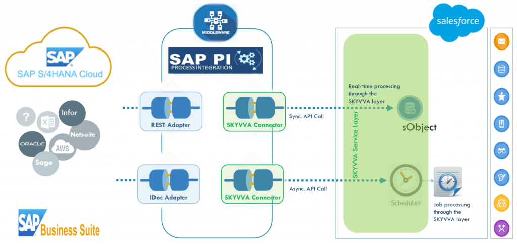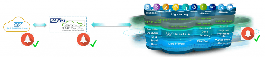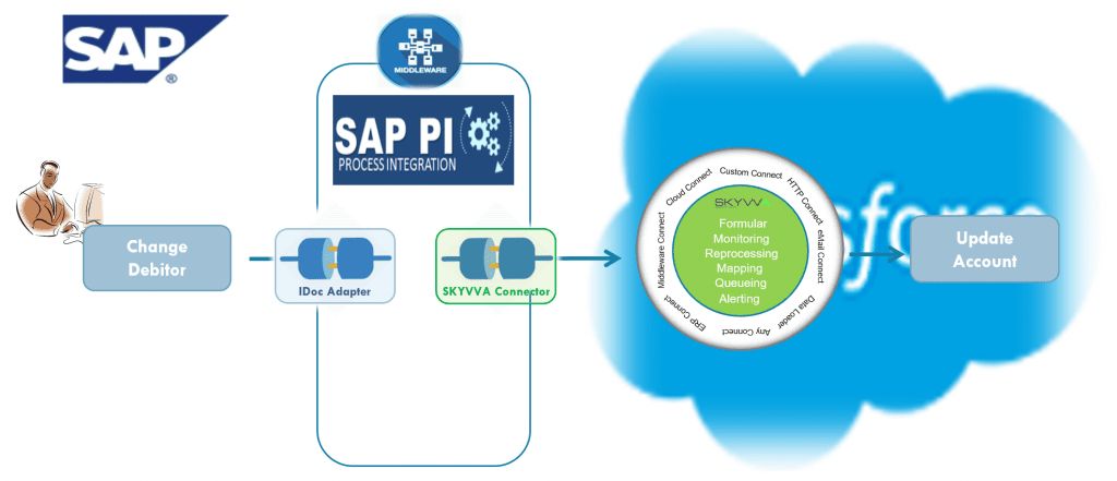 Wie lässt sich diese Situation also lösen? Schauen wir uns nun das gleiche Szenario an, das wir mit SKYVVA nachgebaut haben. In diesem Fall verwenden Sie den SKYVVA-Konnektor auf der SAP-PI/PO-Seite. Auf der Salesforce-Seite verwenden Sie die SKYVVA-Service-Schicht.