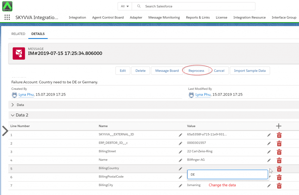 Bleiben wir bei dem obigen Beispiel, das wir zur Darstellung der Überwachung verwendet haben. Werfen wir einen Blick auf die rote Meldung in der SKYVVA-Überwachung. Nehmen wir an, dass Sie als Salesforce-Benutzer oder -Administrator den Geschäftsfehler klar verstehen und die Adressänderung vornehmen müssen, weil Sie das Angebot noch heute vor Ende des Geschäftstages an den Kunden senden müssen. Sie können nicht bis zum nächsten Tag warten und riskieren, den Auftrag zu verlieren. Sie nehmen Ihr Telefon und rufen Ihren SAP-ERP-Kollegen an, um die falsche Nachricht noch einmal zu senden. Sie erreichen ihn, aber leider hat er das Büro bereits verlassen, weil es kurz vor Büroschluss war. Ihr SAP-ERP-Kollege kann die Nachricht heute nicht noch einmal senden und verspricht, sie morgen früh zu senden. Aber das wird Ihnen nicht helfen, denn morgen früh ist es zu spät für Ihre Notsituation. Was können Sie also tun?