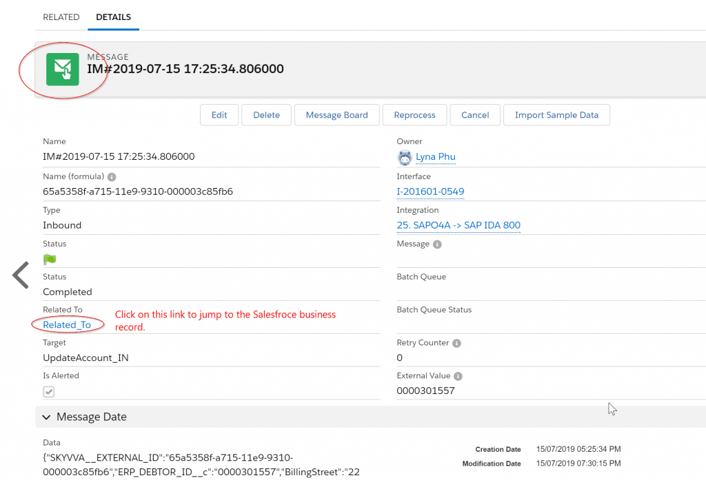 Was Sie in diesem Fall tun können, ist, den Debug-Trace aufzurufen und zu versuchen, die Ursache zu finden, warum die Adresse nicht aktualisiert wurde. Wahrscheinlich werden Sie etwas finden, wahrscheinlich aber auch nicht. Als Salesforce-Benutzer oder -Administrator können Sie sich nicht beim SAP-PI-Middleware-Team oder beim SAP-ERP-Team beschweren, denn alle werden Ihnen durch ihre Überwachung beweisen, dass die Daten erfolgreich gesendet wurden, was Sie an der grünen Flagge sehen können. Was können Sie also tun, um die Ursache auf einfache Weise zu finden?