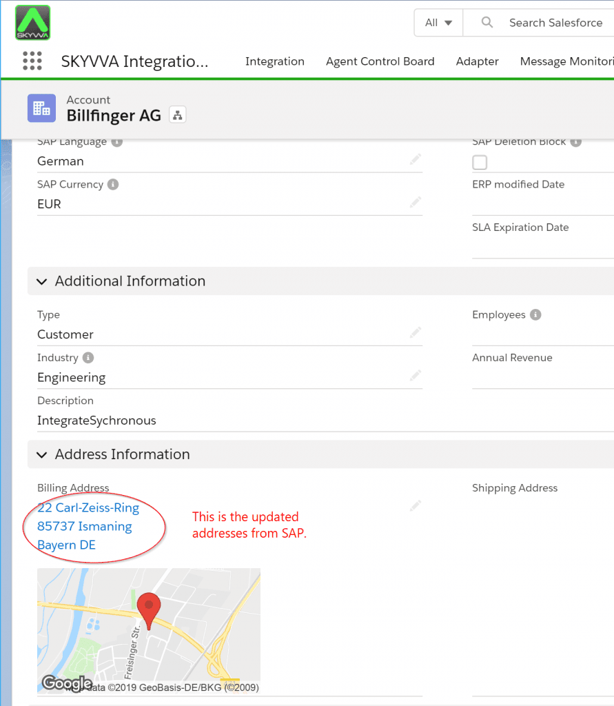 Auf diesem Bildschirm sehen wir die in SAP geänderten Daten für den Kunden 301557 und die alte Adresse in Salesforce. Wir erwarten, dass die geänderte Adresse aus Salesforce auf der Salesforce-Seite aktualisiert wird.