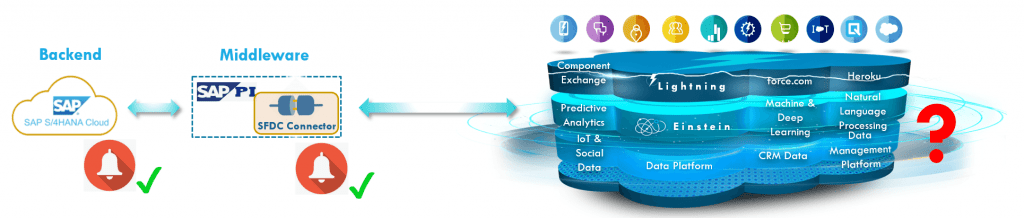 Wie können wir diese Probleme überwinden? Der einzig richtige Ansatz, um Warnungen pünktlich, korrekt und mit der ursprünglichen Ursache zu liefern, besteht darin, die Alarmierungskomponente auch direkt in Salesforce zu haben. Wie Sie in der obigen Abbildung sehen können, hat jede Komponente, z.B. SAP-ERP und SAP-PI/PO, ihre eigene Warnkomponente. Es gibt einen guten Grund, für jede Plattform eine eigene Warnkomponente zu haben. Lassen Sie uns nun sehen, wie wir eine solche native Warnungskomponente in Salesforce haben können.