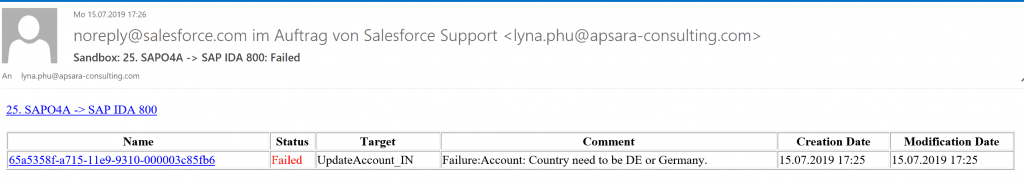 Wie Sie auf dem Bildschirm sehen können, haben wir auch eine Überwachung in Salesforce, wo Sie sofort sehen können, was die Ursache war. Der Fehler ist klar und verständlich für den Salesforce-Benutzer und Administrator. Jetzt finden Sie den Fehler innerhalb von Minuten statt Stunden, ohne Ihr Apex-Entwicklerteam einzubeziehen. Dies ist eine echte End-2-End-Überwachung, die Ihr Middleware-Integrationsszenario verbessert.
