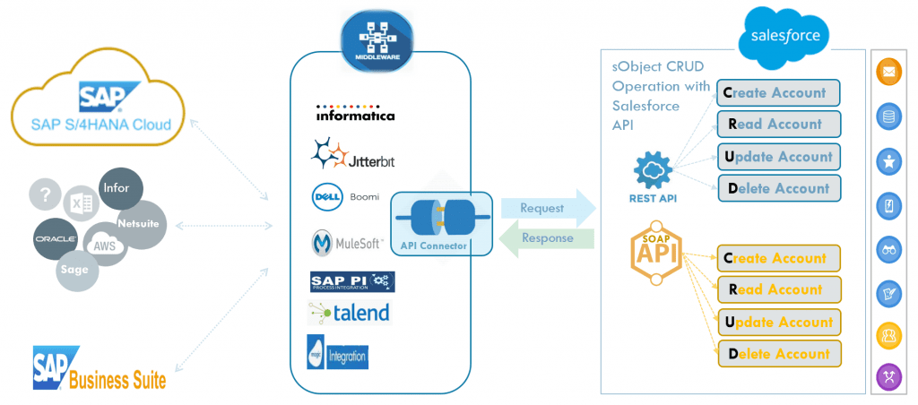 Werfen wir einen Blick auf die Salesforce-Integration mithilfe der Middleware und verstehen Sie. Für die Verbindung zu Salesforce stellt die Middleware einen technischen Konnektor bereit, der die SOAP- oder REST-API der Salesforce-Standard-API aufrufen und nutzen kann. Dabei wird das für APIs übliche Anfrage-/Antwort-Muster verwendet, und jeder Aufruf wartet, bis der Vorgang auf der Salesforce-Seite abgeschlossen ist. Dies ist die Natur des synchronen API-Aufrufs, der dem Muster der eng gekoppelten Architektur folgt. Mit der Standard-API von Salesforce können Sie die vier grundlegenden sogenannten CRUD-Operationen durchführen, d. h. Sie können ein sObject erstellen, lesen, aktualisieren und löschen.