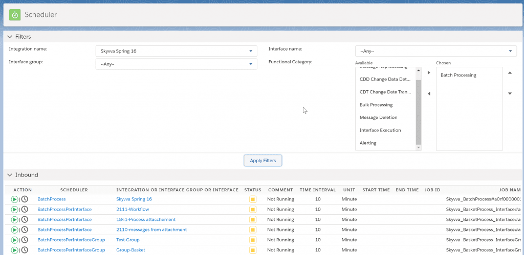Wenn Sie der Datenbuchung Geschäftslogik hinzufügen müssen, stellt Salesforce Ihnen großartige und flexible Tools wie Apex, Trigger, Process Builder und Flow zur Verfügung. Verwenden Sie eines davon, um Ihrer reinen Datenverarbeitung in Verbindung mit der SKYVVA-Schnittstelle Geschäftslogik hinzuzufügen. - Batch and Scheduling